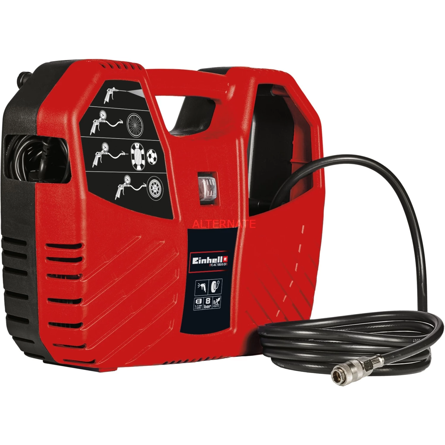 Der Einhell Kompressor TC-AC 180/8 OF ist ein kleiner, mobiler Druckluft-Kompressor in einem handlichen Kofferdesign. Die leichte und kompakte Bauweise überzeugt durch einen ergonomischen Tragekomfort, durch den der Kompressor jederzeit mobil eingesetzt und auch platzsparend aufbewahrt werden kann. Angetrieben wird der Kompressor von einem öl- und service-freien Motor und bietet damit einen geringen Wartungsaufwand. Die Einsatzmöglichkeiten des Kompressors mit maximal 8 bar Druck sind breit gefächert, beispielsweise das Aufpumpen von Auto- und Fahrradreifen, Bällen, Schwimmbecken und Luftmatratzen, ebenso wie das Aus- und Abblasen von Werkstücken, Oberflächen, Gehäusen und Motoren in der Werkstatt. Im Lieferung sind eine Ausblaspistole, ein Reifenfüllmesser und ein 8-teiliges Adapter-Set sowie ein 3 Meter langer Druckluftschlauch mit Schnellkupplung enthalten. Ein praktisches Aufbewahrungsfach für das Zubehör ist im Gehäuse integriert.