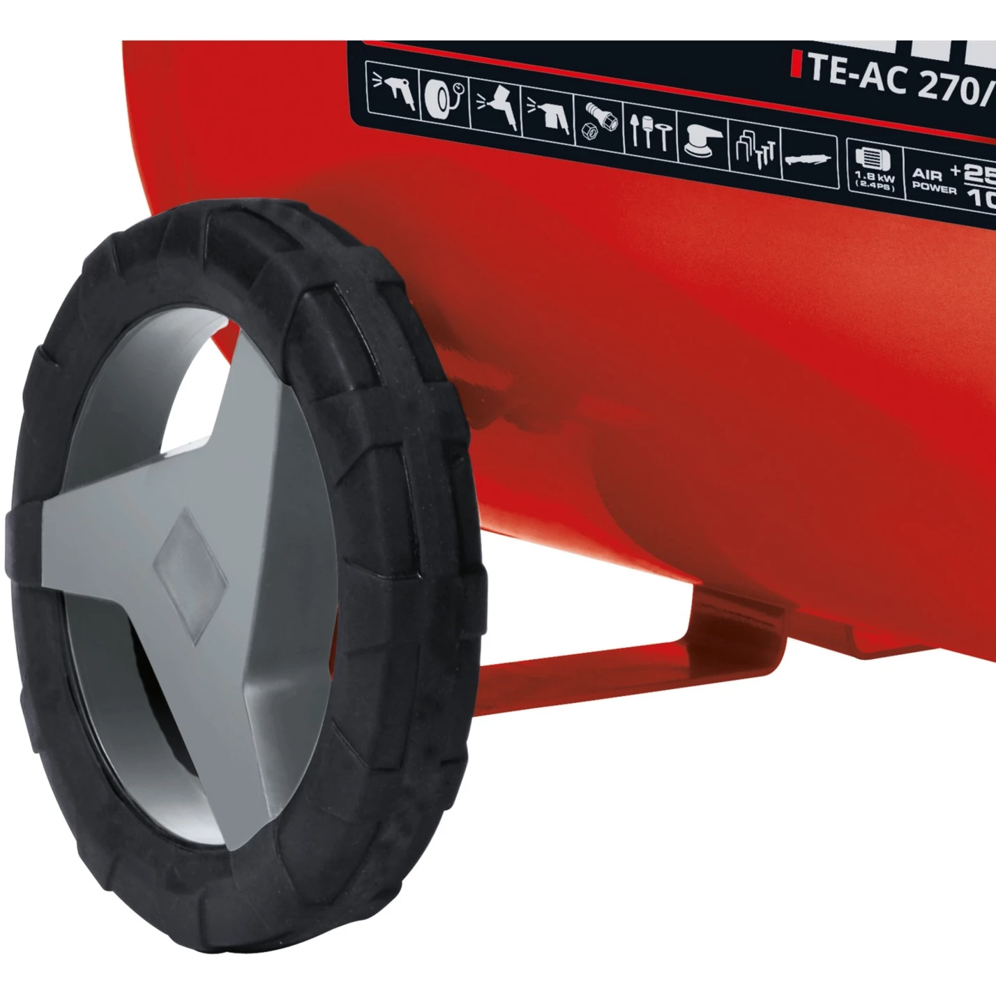 Der Einhell Kompressor TE-AC 270/50/10 ist ein leistungsstarker, robuster Dauerläufer für hohe Anforderungen. Dank hochwertiger Komponenten und Ölschmierung erzielt er eine sehr hohe Laufzeit. Der Ölstand lässt sich mithilfe des Schauglases und großer Druckanzeigen bequem per Sichtkontrolle prüfen. Mittels Druckminderer lässt sich der Arbeitsdruck von bis zu 10 bar auf viele Anwendungen einstellen. Mit 50 Litern Kesselvolumen hält der Kompressor massive Druckluftreserven für jede Anwendung bereit. Der geregelte Arbeitsdruck des TE-AC 270/50/10 lässt sich bequem am großen Manometer ablesen und über zwei Schnellkupplungen entnehmen. Für das Arbeiten mit ungeregeltem Kesseldruck ist ebenfalls ein Manometer sowie eine weitere Schnellkupplung vorhanden. Die praktische Entwässerungsschraube zum Ablassen des Kondensats ermöglicht die komfortable Wartung. Rückschlagventil und Sicherheitsventil sorgen für die sichere Bedienung des TE-AC 270/50/10 während die großen Räder und der Haltebügel den einfachen Transport gewährleisten.