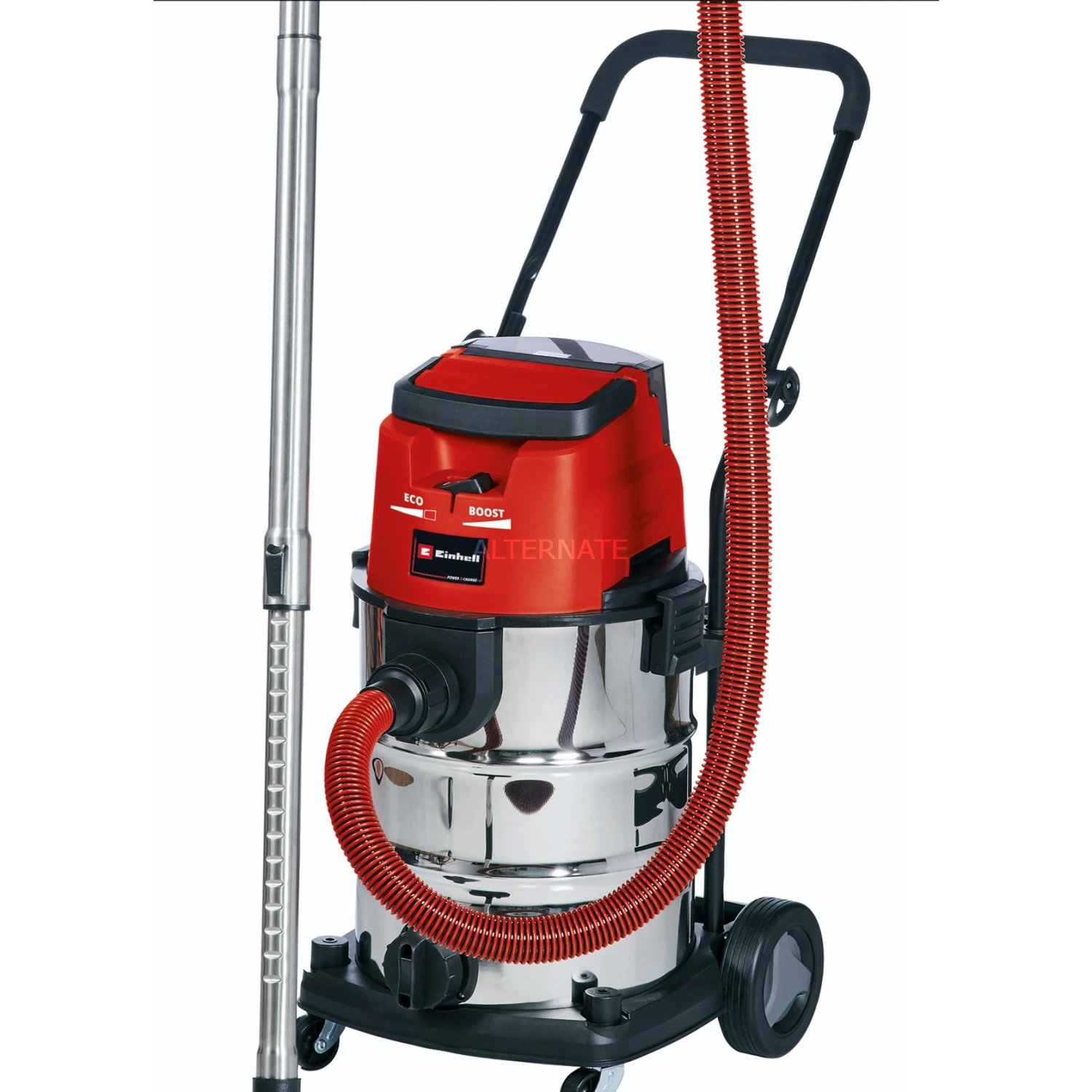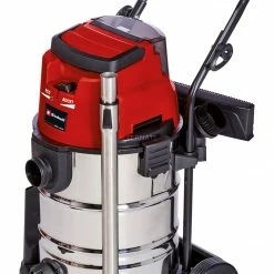 Der Einhell Akku-Nass-Trockensauger TE-VC 36/30 Li S-Solo ist ein großartiger Helfer bei Saug-, Trocknungs- und Reinigungsarbeiten im Haus, im Keller, der Werkstatt oder der Garage. Der Akku Nass-Trockensauger ist fern ab der Steckdose absolut flexibel einsetzbar und durch die leistungsstarken und langanhaltenden Akkus auch bei schwierigen Einsätzen immer der passende Helfer in der Hand. Die Akkus der kompletten Systemreihe PXC-Familie können verwendet werden. Dank den zwei Geschwindigkeiten ECO und BOOST wird der Akku optimal genutzt. Der Edelstahlbehälter fasst 30 Liter, ist rostfrei und stabil gefertigt. Der Blasanschluss ist zum Anblasen von schwer zugänglichen Stellen wie Ecken, Nischen und Zwischenräume gedacht. Große Rollen und Räder ermöglichen einen einfachen Transport. Praktisch ist insbesondere die Zubehörhalterung zum sauberen Verstauen, damit während den Arbeiten ein Griff auf das Zubehör genügt. Zum einfachen und schnellen Ablassen des eingesaugten Wassers ist eine Wasserablassschraube vorhanden. Am Handgriff befindet sich ein Fehlluftregler. Das Teleskoprohr mit einer Länge von 36 mm ist aus Edelstahl gefertigt.