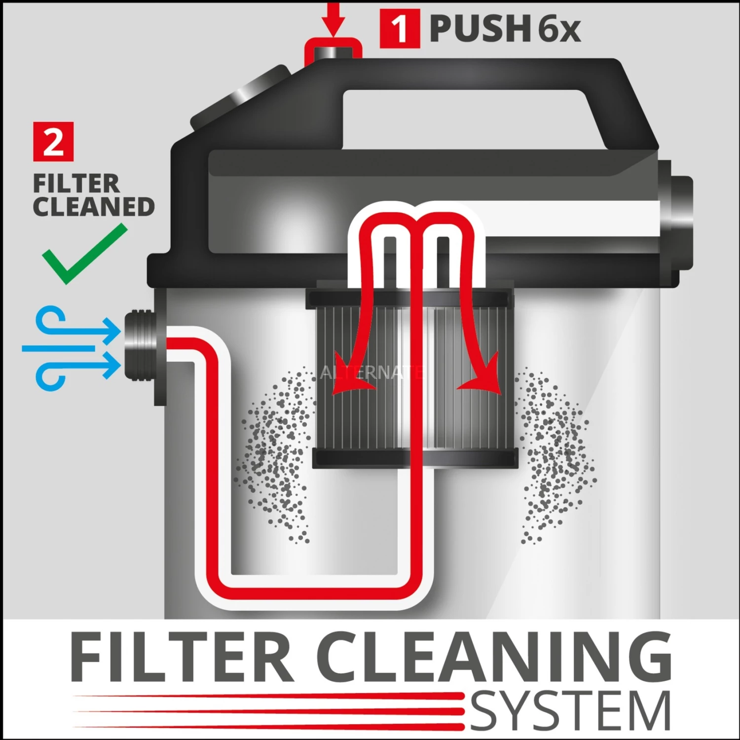 Der Einhell Nass-Trockensauger TE-VC 2025 SACL ist ein hochwertiger, 1.200 Watt starker ECO-Staubsauger der Staubklasse L nach Euronorm. Der Nass-Trockensauger leistet bei allen Arten wasserunempfindlicher Oberflächen sorgfältige Dienste. Durch die Filterung des feinen Staubes ist der Nass-Trockensauger besonders geeignet für Allergiker. Das Filterreinigungssystem sorgt für die Wiederherstellung der Saugleistung. Die Saugleistung ist stufenlos durch die Geschwindigkeitsregelung einstellbar, der Blasanschluss ist geeignet zum Ausblasen von schwer zugänglichen Stellen. Am Gerät ist eine automatische Gerätesteckdose (230 Volt, max. 2.200 Watt) zum Anschluss von Elektrowerkzeugen für den Heimwerkerbereich integriert. Der rostfreie, stabile Edelstahlbehälter fasst 25 Liter. Eine Wasserablassschraube unterstützt das bequeme Ablassen des aufgesaugten Wassers. Große Räder und Rollen sorgen für einen einfachen Transport, eine Kabelaufwicklung und Saugrohrhalterung sind am Gehäuse integriert. Eine praktische Zubehörhalterung hält die Düsen im Griffbereich und dient dem sauberen Verstauen des umfangreichen Zubehörs.