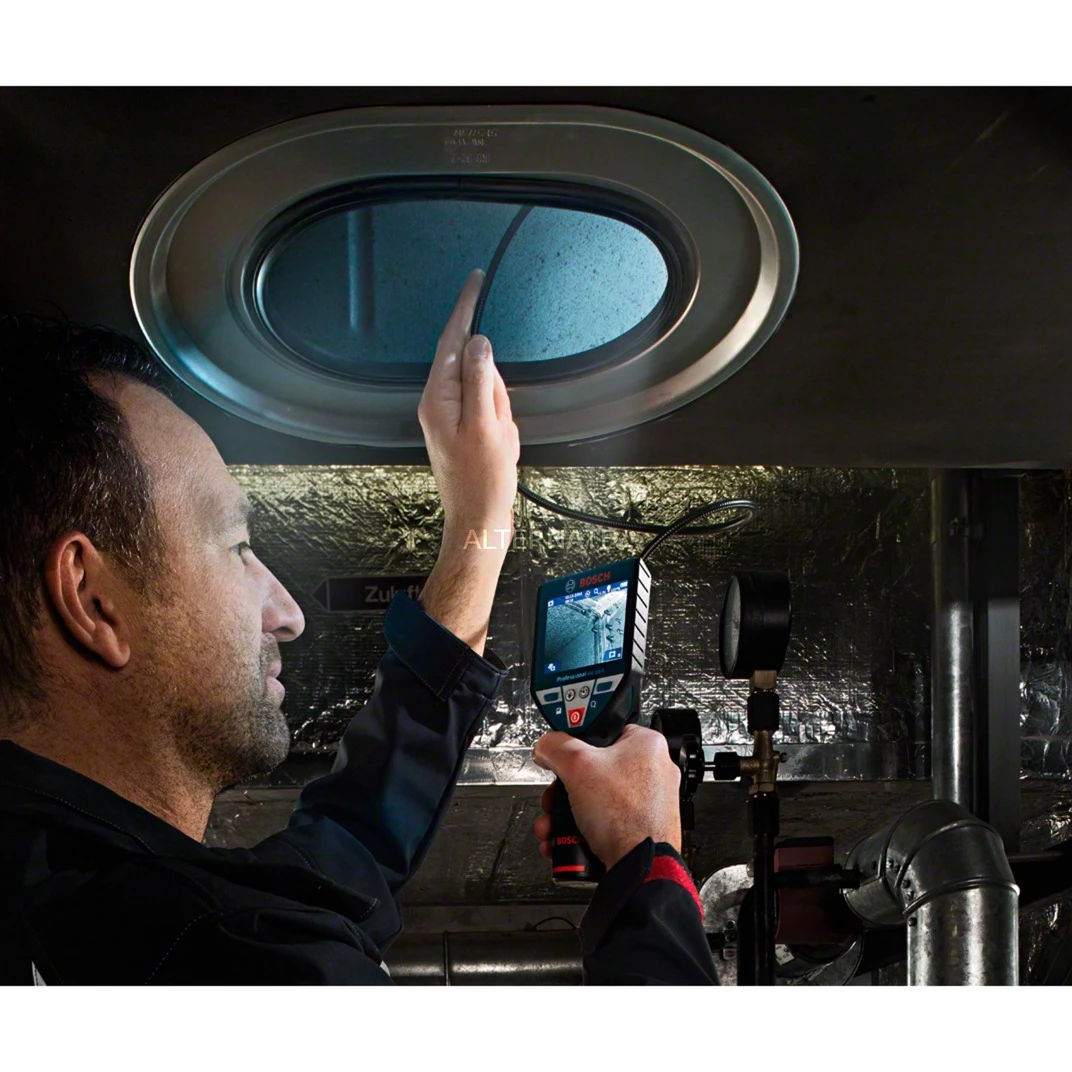 Die Bosch Inspektionskamera GIC 120 C Professional bietet dem Nutze optimale Orientierung durch die „Up is Up“™ Funktion. Die Übertragung von Bildern und Videos zur Dokumentation läuft direkt über das Micro-USB-Kabel oder die MicroSD-Karte. Der Dual power Source Modus ermöglicht den Betrieb der Inspektionskamera GIC 120 C sowohl mit 10,8V Akku als auch mit Standard-Alkalinebatterien. Der Digitale Zoom und die LED-Leuchte verbessern die Sicht des Nutzers auf das Objekt.