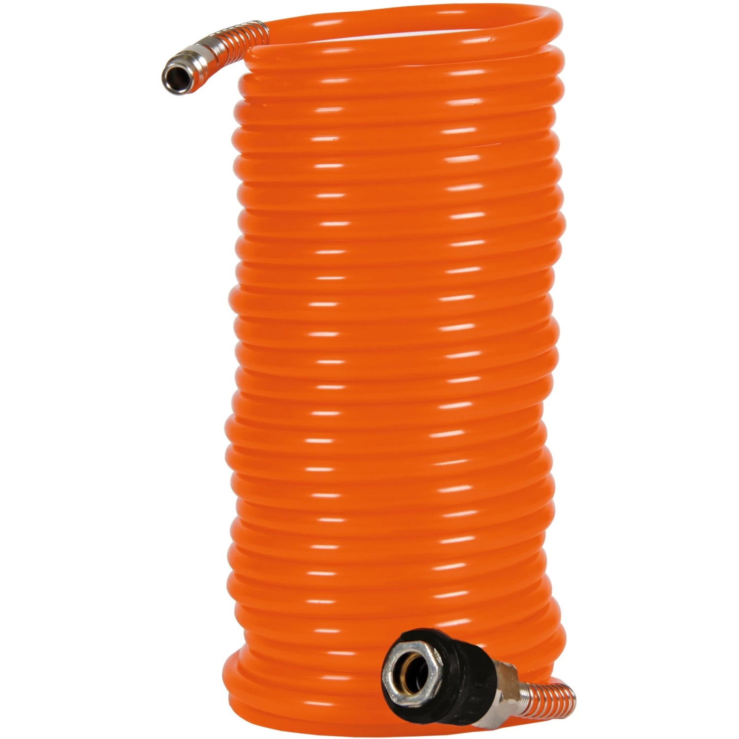 Der Spiralschlauch von Einhell aus robustem PU-Material ist 8 Meter lang und mit einer Schnellkupplung und einem Stecknippel ausgestattet. Er eignet sich für den Anschluss an Kompressor und Zubehör. Der Schlauch ist für einen maximalen Arbeitsdruck von 8 bar ausgelegt. Der Innendurchmesser von 6mm ermöglicht die Verwendung von Werkzeugen mit hohem Luftverbrauch.