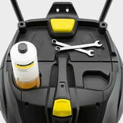 Der hochwertige Nass-/Trockensauger NT 40/1 Ap L von Kärcher mit seinen 40 Litern Fassungsvermögen des Behälters und halbautomatischer Filterabreinigung, die im Zusammenspiel mit der herausragenden Saugleistung sogar dann die Entfernung von Feinstäuben ermöglicht, wenn ohne Filtertüte gearbeitet wird, ist vielfältig einsetzbar, ob zur Beseitigung von Grobschmutz und Flüssigkeiten, zum Absaugen von Maschinen und Anlagen oder beispielsweise auch zur Fahrzeuginnenreinigung, und gespickt mit durchdachten Details zur Aufbewahrung des komplett neu entwickelten Zubehörs. Unter anderem wurde sein Kopf so flach entworfen, dass mühelos ein Werkzeugkoffer darauf abgestellt und dank der Verzurrmöglichkeiten auch befestigt werden kann. Darüber hinaus überzeugt der NT 40/1 Ap L mit seiner sehr einfachen Bedienbarkeit. Dabei werden alle wichtigen Funktionen direkt über einen zentralen Drehschalter ausgewählt und eingestellt.