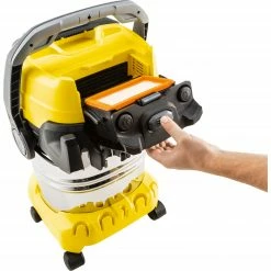 Der Nass-/Trockensauger WD 6 P S V-30/6/22/T von Kärcher bietet einen 30-Liter-Edelstahlbehälter, ein 6 m langes Kabel und einen 2,2 m langen Saugschlauch. Über die integrierte Steckdose mit Ein-/Ausschaltautomatik können Elektrowerkzeuge wie Sägen oder Schleifgeräte angeschlossen werden. So wird der anfallende Schmutz wird direkt abgesaugt. Über einen Drehschalter lässt sich die Saugleistung bedarfsgerecht regulieren. Die Entnahme des Flachfaltenfilters erfolgt ganz ohne Schmutzkontakt durch das Herausklappen der Filterkassette. Zudem lässt sich der Filter durch Betätigung der Abreinigungstaste effizient reinigen und so die Saugleistung einfach wiederherstellen. Bei der Reinigung filigraner Gegenstände kommt die Blasfunktion zum Einsatz. Der abnehmbare Handgriff mit elektrostatischem Schutz erlaubt eine Zubehöranbringung direkt am Saugschlauch, das ist vor allem beim Saugen von Feinstaub nützlich. Weitere Pluspunkte sind die platzsparende Verstauung des Saugschlauchs durch Einhängen am Gerätekopf auf beiden Seiten und die Parkposition der Bodendüse. Mit der Ablassschraube werden aufgesaugte Flüssigkeiten komfortabel abgelassen.