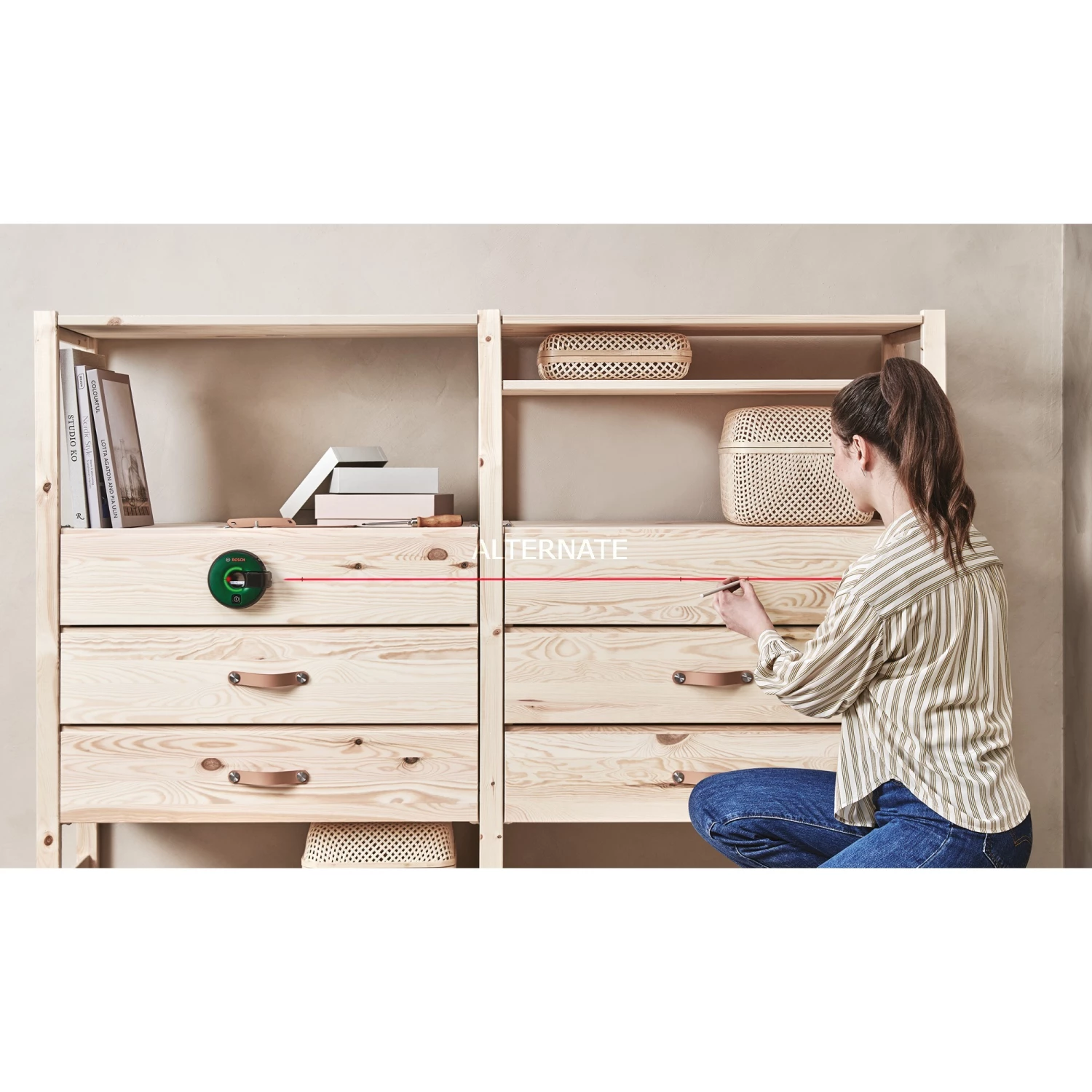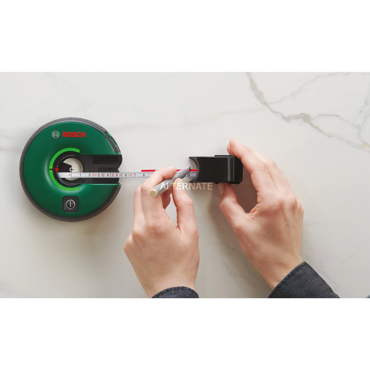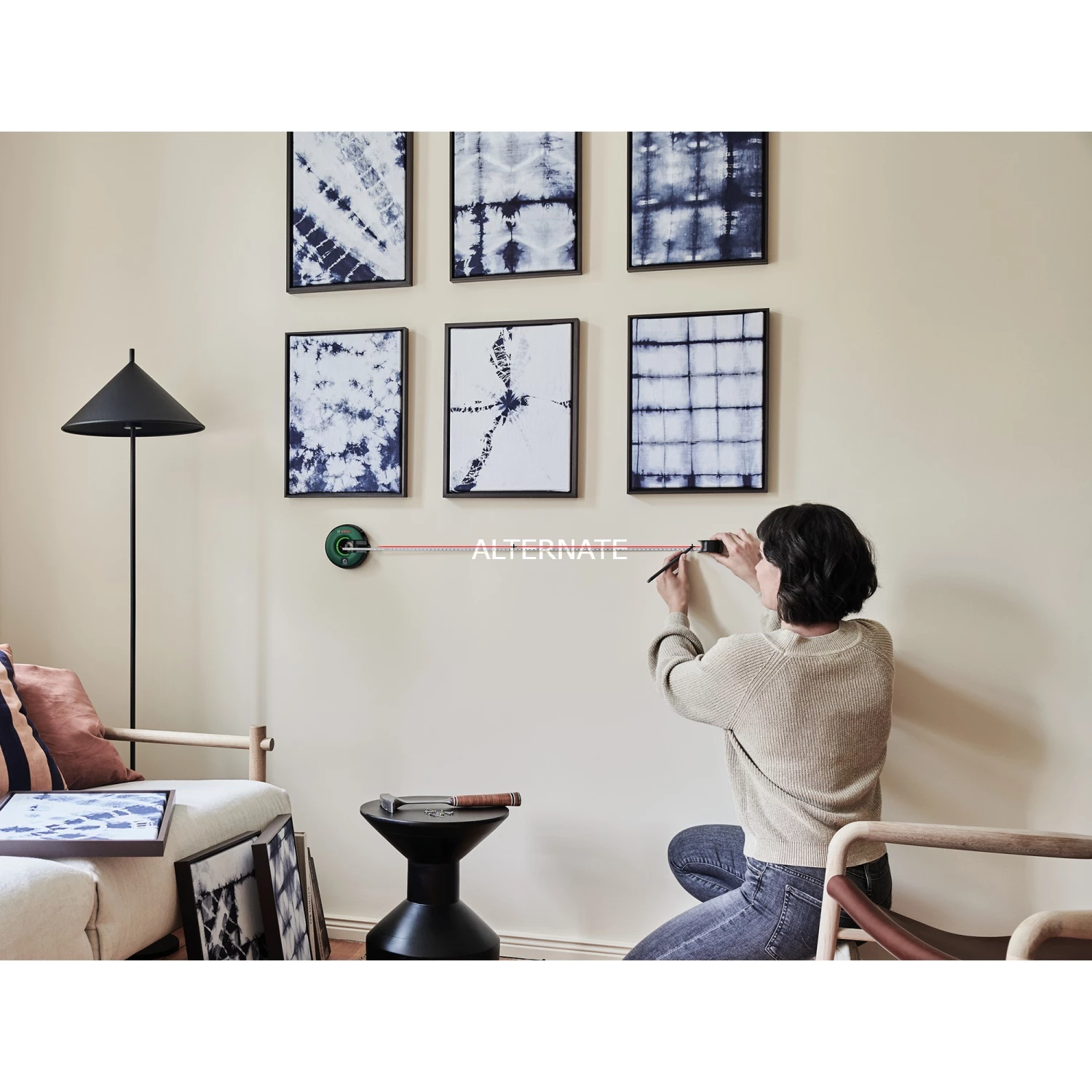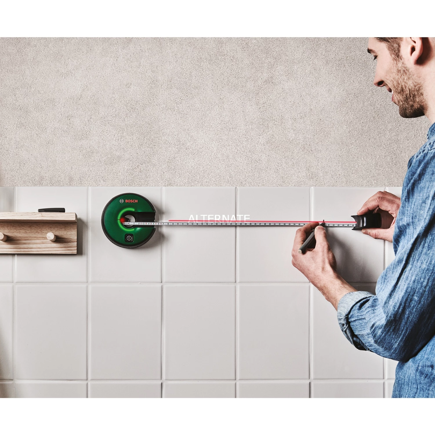 Der Linienlaser Atino von Bosch ermöglicht das Ausrichten von Bildern oder Regalen ohne Hilfe von anderen Personen. Er kombiniert alle wichtigen Funktionen eines Linienlasers mit einem integrierten 1,5 Meter Maßband. Der Atino kann mit dem innovativen Gelpad auf glatten unempfindlichen Oberflächen wie Fliesen, Beton oder Marmor befestigt werden. Bei rauen, verputzten Oberflächen oder Tapete ist die Pinplatte mit den zwei kleinen Pins die ideale Befestigungslösung. Der Linienlaser Atino eignet sich für verschiedenste Aufgaben, zum Ausrichten oder Aufhängen von Bildern und Regalborden, zum Befestigen von Haken und Handgriffen oder zum Anordnen von Gegenständen, der Atino ist alles, was man dazu braucht. Er ermöglicht das Ausrichten über eine intuitive LED-Anzeige und bietet eine Genauigkeit der sichtbaren Laserlinie von ± 0,3°. Die Laserlinie kann entweder waagerecht nach rechts (90°) bzw. links (270°) oder senkrecht nach oben (0°) bzw. unten (180°) einnivelliert werden. Der Nivellierungszustand wird durch den Leuchtring angezeigt.