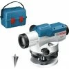 Das optische Nivelliergerät GOL 20 G Professional von Bosch ist zum Ermitteln und Überprüfen von exakt waagerechten Höhenverläufen bestimmt, sowie zum Messen von Höhen, Entfernungen und Winkeln, mit Skala in Maßeinheit Gon und Teilung Horizontalkreis 1 gon. Das stabile Metallgehäuse mit Staub- und Spritzwasserschutz (IP 54) ist für den Einsatz im Außenbereich geeignet. Das optische Nivelliergerät GOL 20 G Professional verfügt über einen im Gerät eingebauten Zielkollimator, eine integrierte Dosenlibelle und einen großen Fokussierknopf zum einfachen Ausrichten. Das lichtstarke Objektiv erzeugt ein scharfes Bild der Messlatte, und die Sperrvorrichtung für den Kompensator gewährleistet einen sicheren Transport.