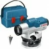 Das optische Nivelliergerät GOL 26 G Professional von Bosch ist zum Ermitteln und Überprüfen von exakt waagerechten Höhenverläufen bestimmt, sowie zum Messen von Höhen, Entfernungen und Winkeln, mit Skala in Maßeinheit Gon und Teilung Horizontalkreis 1 gon. Das stabile Metallgehäuse mit Staub- und Spritzwasserschutz (IP 54) ist für den Einsatz im Außenbereich geeignet. Das optische Nivelliergerät GOL 26 G Professional verfügt über einen im Gerät eingebauten Zielkollimator, eine integrierte Dosenlibelle und einen großen Fokussierknopf zum einfachen Ausrichten.