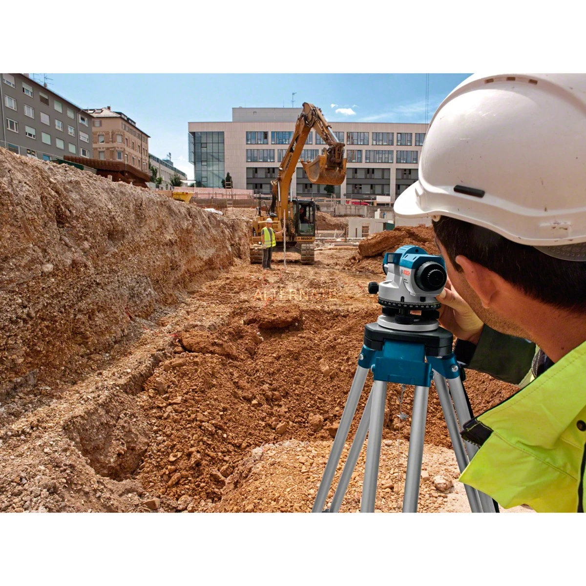Das optische Nivelliergerät GOL 32 G Professional von Bosch ist zum Ermitteln und Überprüfen von exakt waagerechten Höhenverläufen bestimmt, sowie zum Messen von Höhen, Entfernungen und Winkeln, mit Skala in Maßeinheit Gon und Teilung Horizontalkreis 1 gon. Das stabile Metallgehäuse mit Staub- und Spritzwasserschutz (IP 54) ist für den Einsatz im Außenbereich geeignet. Das optische Nivelliergerät GOL 32 G Professional verfügt über einen im Gerät eingebauten Zielkollimator, eine integrierte Dosenlibelle und einen großen Fokussierknopf zum einfachen Ausrichten. Das lichtstarke Objektiv erzeugt ein scharfes Bild des Ziels, und die Sperrvorrichtung für den Kompensator gewährleistet einen sicheren Transport.