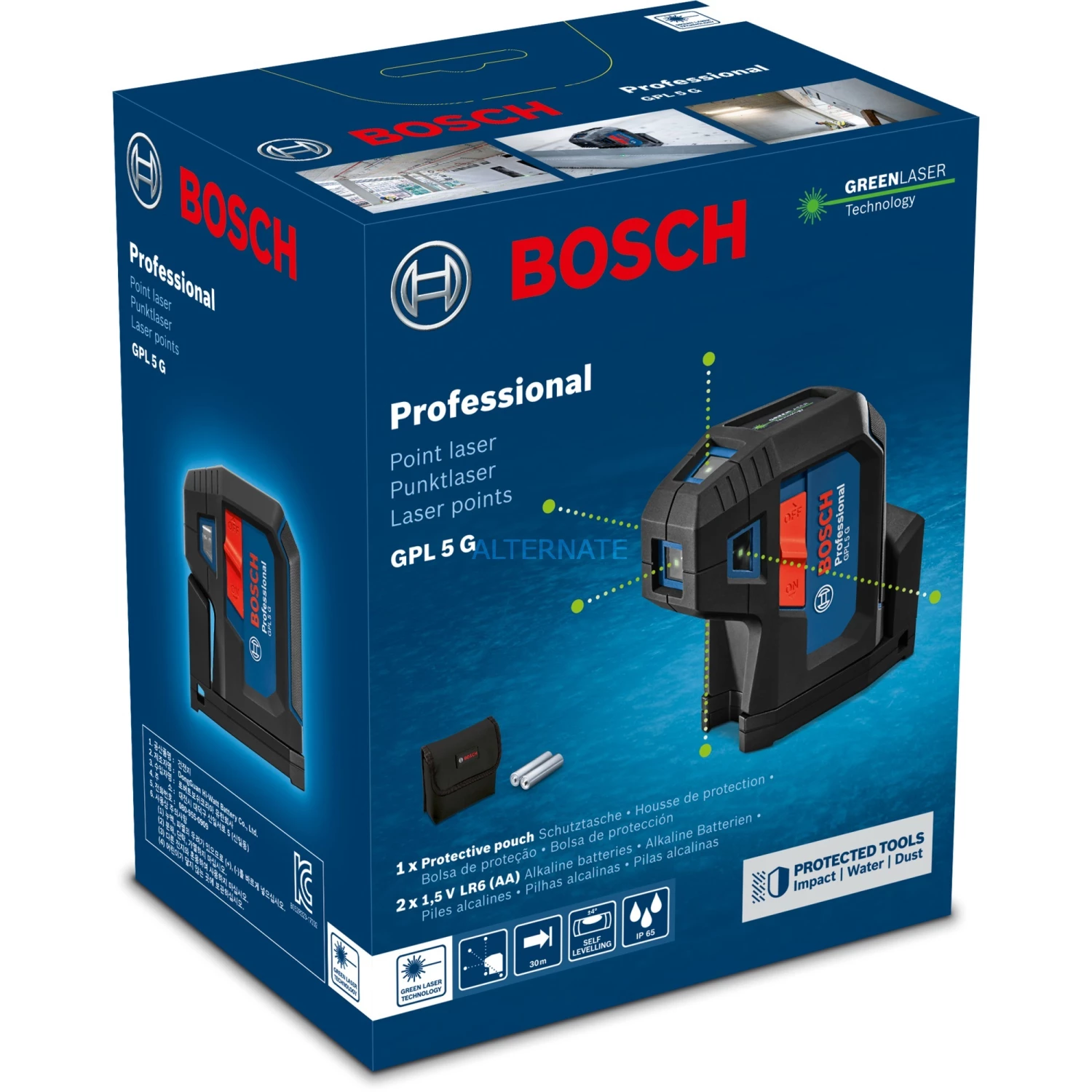 Der Bosch Punktlaser GPL 5 G Professional überzeugt mit seinem strapazierfähigen und kompakten Design. Seine grünen Laserpunkte bieten eine bis zu viermal bessere Sichtbarkeit als rote Punkte. Er ist die ideale Wahl für Übertragungen bei Wänden mit 90°-Winkel. Das gummi-ummantelte Gehäuse und das eingelassene Glas in Verbindung mit dem Staub- und Spritzwasserschutz nach IP 65 lassen den GPL 5 G Professional auch den rauesten Baustellenbedingungen trotzen. Der 5-Punkt-Laser ist dank der eingebauten Drehhalterung mit starken Magneten für schnelle und sichere Werkzeugbefestigung in kürzester Zeit transportbereit. Der GPL 5 G Professional eignet sich zur Raumaufteilung mit 90-Grad-Winkeln und zur Übertragung von Referenzpunkten vom Boden zur Decke, für Klempnerarbeiten und zur Errichtung von Trockenbauwandrahmen. Er verfügt außerdem über ein benutzerfreundliches Interface mit einem Zweipositionsschalter: Beim Einschalten nivelliert der Laser sich automatisch selbst, beim Ausschalten wird die Pendelarretierung aktiviert.