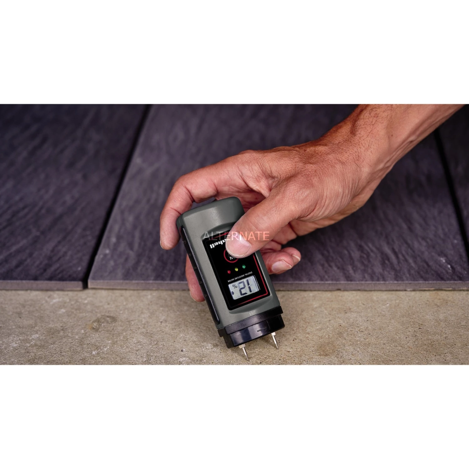 Das kompakte und präzise Holzfeuchte-Messgerät /1 von Einhell ist ein praktischer Helfer zum Messen des Feuchtigkeitsanteils von verschiedenen Hölzern (auch Papier, Pappe) und Feststoffen wie Mörtel, Beton oder Gips. Presst man die beiden spitzen Elektroden in das zu messende Material, wird das Ergebnis reaktionsschnell auf dem LCD-Display angezeigt. Das eingebaute Thermometer ermöglicht außerdem die Messung der Umgebungstemperatur.