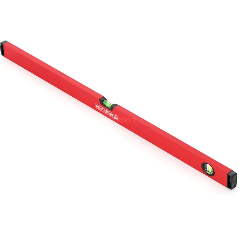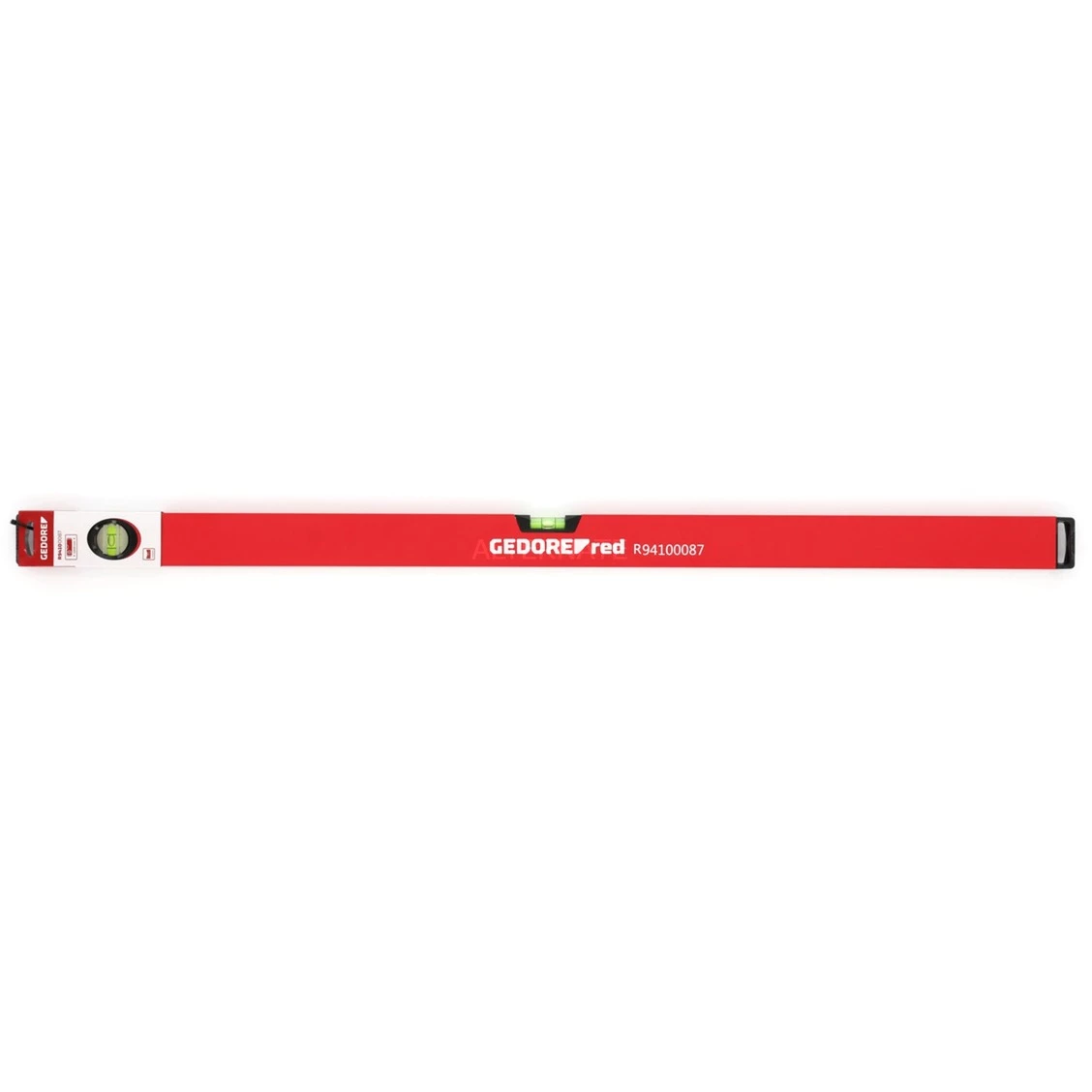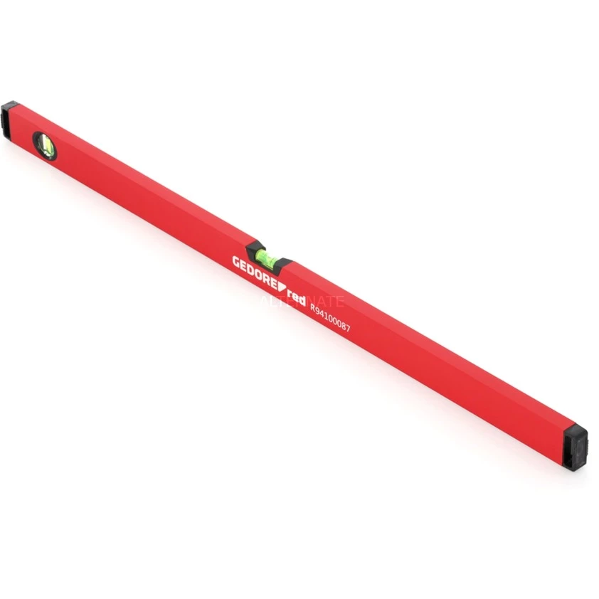 Die GEDORE red Wasserwaage R94100087 besteht aus einem glatten Aluminium-Rechteckprofil und einer Vertikal-Libelle und einer Horizontal-Libelle aus Acrylglas. Sie ist rot pulverbeschichtet, die Endkappen sind aus schwarzem, stoß- und schlagfestem Kunststoff. Außerdem ist sie mit einem Aufhängeloch ausgestattet.